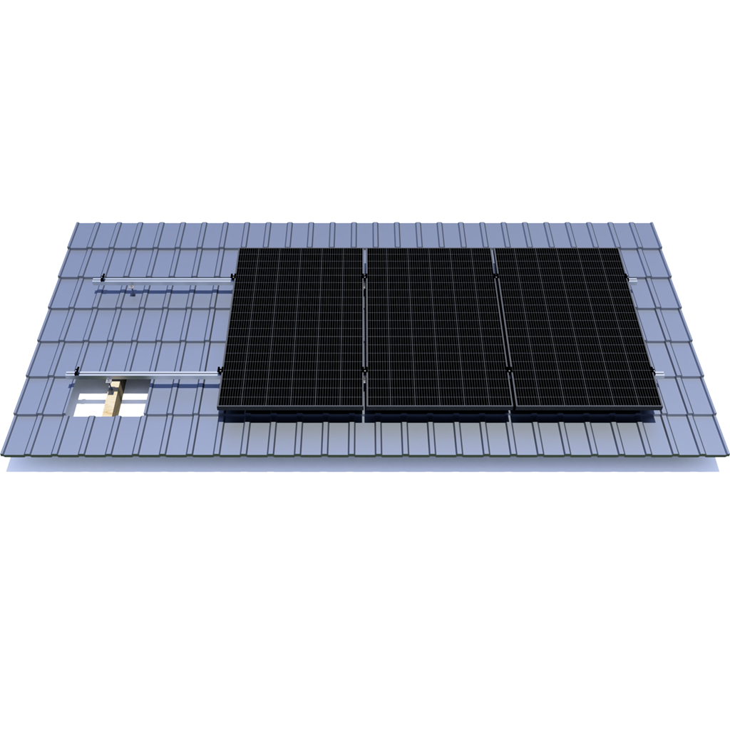 System mocowań paneli fotowoltaicznych dostosowany do tego rodzaj pokrycia dachu oparty jest na aluminiowej szynie montażowej. Konstrukcję mocuje się do krokwi za pomocą śruby dwugwintowej.